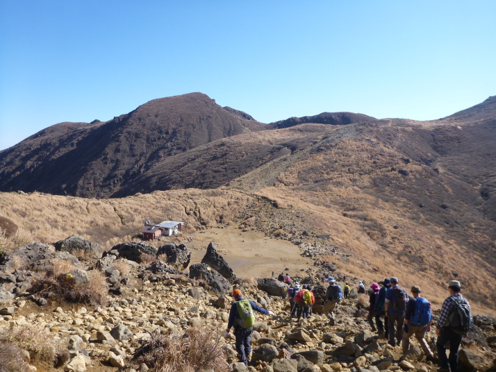 その先、星生山の分岐を越えて岩場を下るとトイレのある避難小屋に到着だ