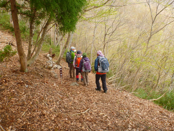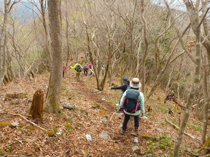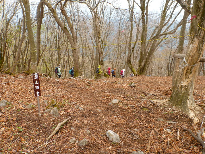 頂上の広い尾根を暫く歩き尾根を離れる所から広葉樹林の落ち葉の敷き詰められた九十九折の登山道を