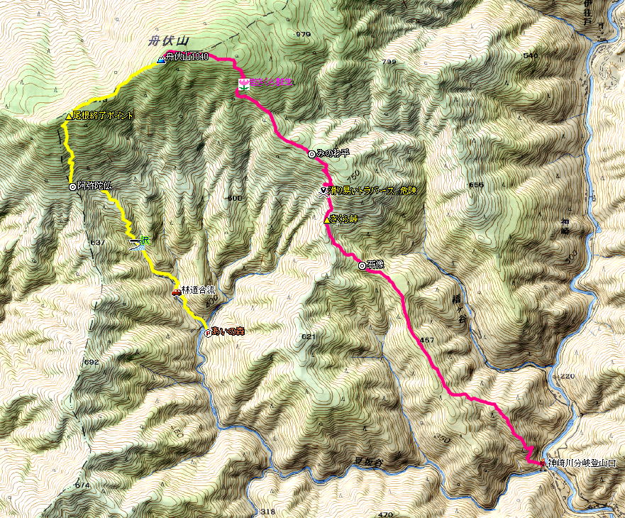 ここで休憩し下り始めるとぬかるんだ沢を歩き単調な尾根伝いの道を下る
