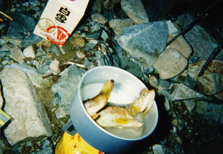 | 何匹釣ったかは覚えて居ないが兎に角今まで見た事も無い様なサイズだ。 今から思えば小さいのだろう。 そうして夜は至福の時を過ごした。 骨酒に岩魚の握り…満天の星空に動物たちの鳴き声? これが俺の原点だった。 翌朝は二俣の左を攻め楽しい釣行を終え夢を追い続ける羽目となったのだ。 |