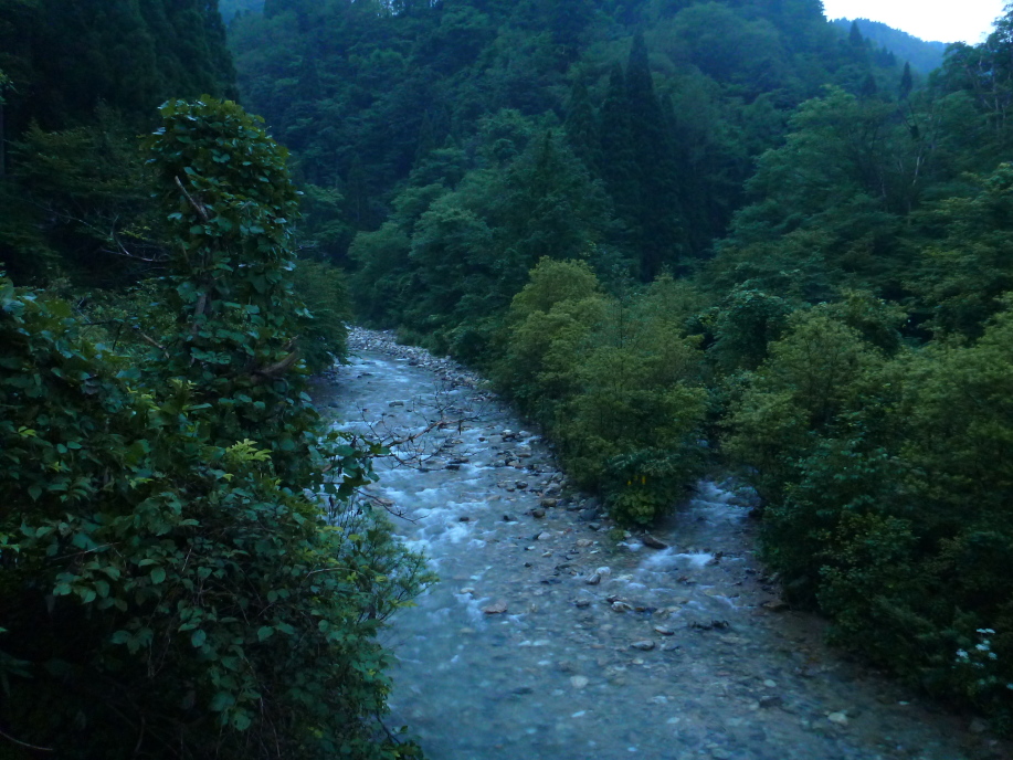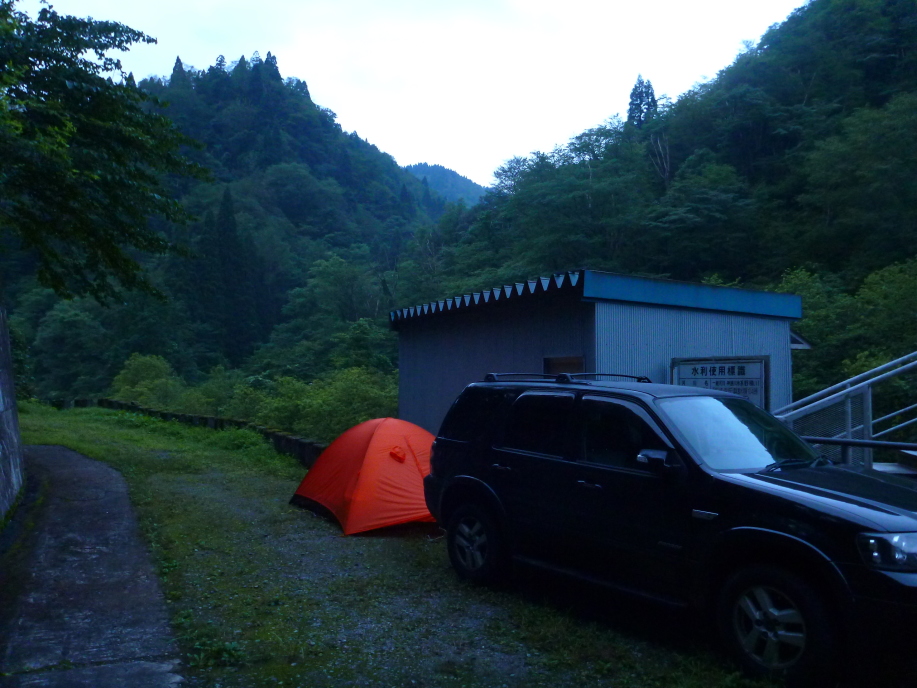 | 絶好のテン場で雨を予想してタープを張り準備万端整った所で三枚滝へ向かう 清流のポイントを絞り餌を放り込めば、やはり8〜9寸が顔を出すが、今晩のおかず用に尺だけを狙い 更に釣上れば何やら急峻な岩が反立ったゴルジュが目の前に現れ、絶好のポイントが続き 泣き尺を含め尺を魚籠に入れる ゴルジュに入れば三枚滝が現れる 越えられそうな所を探すが、我々には難しいゴルジュだ 刺身用も含めテン場に置いた活かし魚籠の3匹を含めて7匹確保してテン場に戻り 今宵の宴の準備に取り掛かる 先ずは槇集め…焚火、刺身の準備はUi君に任せ自分は塩焼きの準備だ 準備が出来れば当たり前のように乾杯! 疲れを癒しながら酔い心地で深まる闇を待つ… やがて焚火の炎が点を着く頃、程よく焼けた岩魚の骨酒で更に宴たけなわとなり 釣りの自慢話は尽きない… 良く此処まで持ってくれた…と感謝したいくらいの天気も、やがてポツリポツリとタープに落ち始め 徐々に強くなる雨脚は焚火の炎と競い合い、消えそうになれば雨脚が弱くなり またまた炎が大きくなる…そうはいかせないぞと大粒の雨が勢いよく炎に突き刺す すると炎は押されて小さく小さく… そんな競い合いを酒の肴にタープの下で楽しく過ごすが、雨も止んだ頃 道なき道の遡行で疲れたのか?9時にはテントに潜り込み深い眠りに就いた |