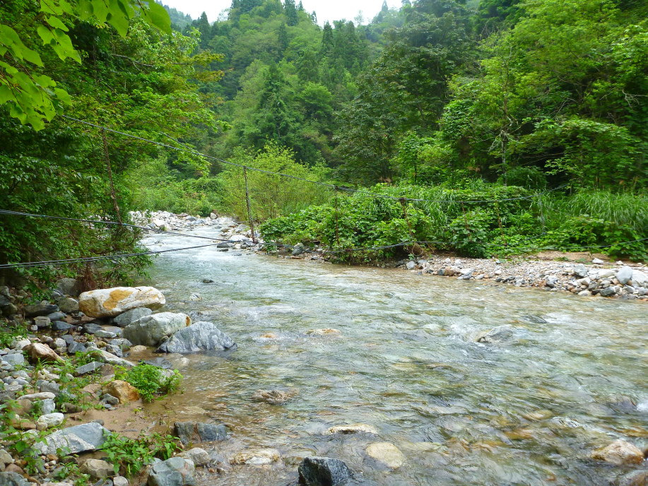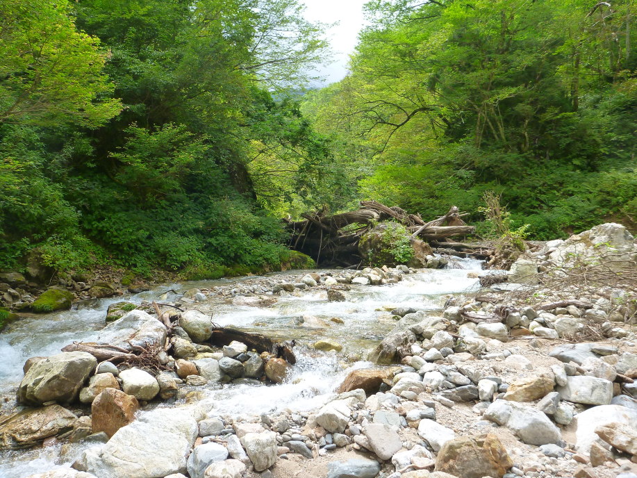 | 今年は夢にまで見た桃源郷を二つもチャレンジする機会が貰えた 期待一杯で仕事を終え20:00、相棒のUi君の運転で一路目的地へ高速を走らせる 高速を下り買い物をして目的地到着は23:30だ、3:30の運転、お疲れ様 早速テントを設営し疲れた身体を何時もの様にビールで癒し、ほどほどで眠りに就く それでも就寝は1:00を過ぎていた。 朝の目覚めは意外に良く心配していた天気もなんとなく持ちそうだ まだ疲れて熟睡中の相棒を置いてテントの外へ… 景色を確かめる。 目の前は取水堰堤、道路はここでゲートで閉じられており、眼下の川は二股になっていて 左又が本流だ。 目覚めるUi君を待ち準備して出かければ既に7:00近くになっていた。 事前に掻き集めた情報をもとに道の川への遡行開始だ 先ずは踏み跡らしきを頼りに入川するが直ぐに堰堤があり、堰堤を越すまでは左に付いた 林道を歩けば良かったと後悔だ。 それでも堰堤は容易に越せてやれやれ 直ぐに壊れた吊橋があり川も二股に分かれており、目指すYMKWは右又だ。 情報ではここから踏み跡が在る筈だが、少し川を遡行した後、山肌を10m程よじ登り 何とかその踏み跡を見つけ先ずは一安心だ。どうもこの踏み跡は吊橋から続いている様だ。 この踏み跡が見つけられるかどうかが今回の遡行の鍵だったので安心して進むが なんとなんと、限りなく不明瞭で、尚且つブッシュが覆い被さっていてなかなか前に進めない 限りなく野生の感で踏み跡を踏み外さず進むが30分ほどして踏み跡が解らず… 直ぐの眼下に川は見えるので然程心配は無いが、それでも20分程探すが解らず川に降り立った。 幸運な事に降り立った河川敷には黄色のテープが先を案内してくれていてラッキー! 少し落ち着いて休憩し、河川敷からテープを目印に進めば目印は無くなっても 何やら踏み跡が続いている様な? そんなこんなでまたまた川からトラバース気味に山肌を掻き分け感頼りに踏み跡らしきを 登れば杉林に入る。杉には明確なテープの巻かれた目印があり辿るものの途中でまたまた見失う。 少し迷うが、上方にテープの巻かれた杉の木を見つけまたまた何とか難を逃れる。 その先山肌にへばりつく大木まで来た所でガレが現れ、30分程巻きガレを下り先の踏み跡へ 辿り着いたのだが、振り返れば高巻か無くても大木の下に危険だがルートが就いていて ロープもついていた。時間のロスをしましたね。 このガレには黒いテープが付いていて道をフォローしてくれている。 踏み跡?獣道?と云うよりは、滑れば真っ逆さまに落ちそうな山肌を進んでいるだけの様で 非常に厳しい登行だ。 黒いテープのガレ沢を越えれば再びかろうじて判る踏み跡を進む、眼下にゴルジュ帯の沢が見えて来た辺りで 道も川も大きく九の字に折れ、更に危険な踏み跡を頼りなく垂れ下がるトラロープを 頼りに一歩ずつ慎重に進めば、対岸に本流に流れ込む沢が見えて来る その先の踏み跡はブッシュに覆われ先は見えづ、ただ下れ!と言わんばかりに真っ直ぐ下降している 数少ない情報によればこの先下らず、真っ直ぐ進めば三枚滝の上流、横谷に続いている筈であるが とても進む気力は無く、なされるままに下降し川に降り立つ。YMKWだ! 降り立った地点から下流を望む…YMKW |
