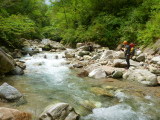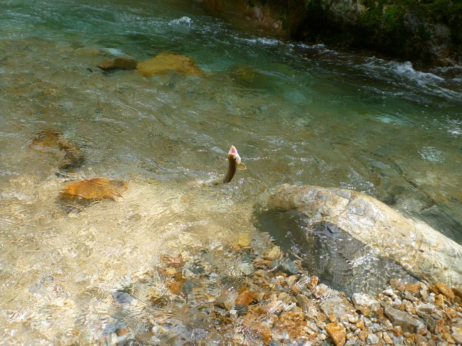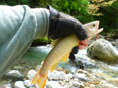| 憧れの真川に降り立ち早々に竿を出す 当たりは即あり8寸クラスが飛び出す 上流を釣りながら進めば、二人とも確かな手ごたえが続く …が…サイズが伸びず やがて現れる堰堤でUi君が尺上を始めて釣り上げる。 取り敢えず真川の初もの、活かし魚籠に入れて先へ進む その先何匹かの9寸前後を魚籠に入れてテン場好適地を 見つけザックを下す 既にこの時点で三枚滝は今日は諦めていた |