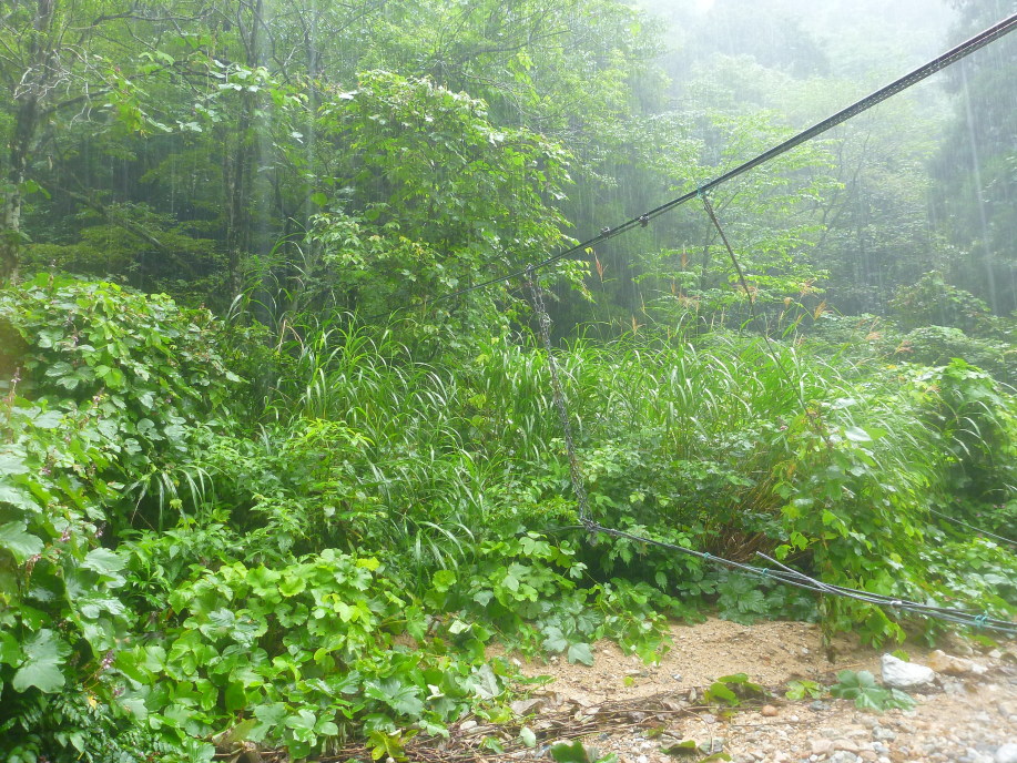 | 深夜テントを叩きつけていた雨も 翌朝目覚めれば雲も薄く西の空には青空も覗いている 今日は三枚滝が越えられるかどうかがカギだが 昨日の状況を見て、二人とも心の中では諦めていた。 担ぎ上げた卵入りの味噌鍋とハンバーグごはんで お腹を満たし、三枚滝を目指す |