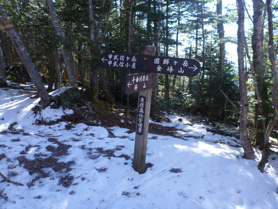 | 一か月前から予定をしていた、立山山スキー、会のメンバーから 山行の誘いがあり、山スキーは翌週の平日に伸ばして、一泊二日で甲武信ヶ岳、金峰山の 百名山を贅沢に二つ登る事とした どちらもピストンで、宿泊は川上村の町田市、自然休暇村だ。 ここは以前、恵那山に登った時に、大阪の方から教えて貰った宿泊施設で 信州牛のステーキが売り物らしい。当然、ステーキを注文しての予約だ。 甲州(山梨県)、武州(埼玉県)、信州(長野県)の境にあるのでこの名になっているとされる説が 有名だが、山容が拳のように見えるからという説もある。 千曲川(新潟県に入ると信濃川)、荒川、笛吹川(釜無川と合流し富士川となる)の水源の地。 頂上に三角点はない。 また、すぐ隣の三宝山のほうが標高が僅かに高い。日本百名山の一つ。 |