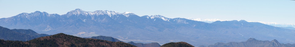 | 大山に到着すれば縦走、初めての大パノラマだ 甲武信ヶ岳からのパノラマと同じで八ヶ岳から浅間山までが くっきりだ 明日行く金峰山、大弛峠、朝日岳~国師ヶ岳の稜線が くっきり見えている |