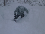 | 自分の車で行く事になり集合場所へは7時集合に… メンバーはTさん、K.ken君、K.iさん、Nさん、別行動のK.ko君、自分の総勢6名だ。 年末の西穂高に向けての大事な訓練、昨日からの大寒波で天気が不安だが、全員意気込みは強く 高速を北に向けていざ! 出足は少し曇り空で、霜の降りたこの地方の野山は薄ら白い。 高速を北上するにつれて雪景色に変わり、道路に白い絨毯が現れ始めた頃から衝突事故を2件見た。 トイレ休憩を挟んで北上し、インターを降りればちょっとした坂道で立ち往生した車やら、スリップ事故やらで 少々渋滞するが、それでも予定より30分程遅れてスキー場に到着。 オープン二日目とあってリフト券の割引もあり大人気のスキー場だ。 早々に準備をしてセンターハウスで受付を済ませてゴンドラでスキー場トップへ… づっと降り続いている雪は更に激しさを増していた。 ゲレンデトップからはいきなりの腰まで埋まるラッセルだ!昨日から降り続く止まない雪は1m以上積もっている。 自分とKko君は山スキーで、他のメンバーはスノーシューだ。 先行者が居る様でトレースは付いているのだがスノーシューでは埋もれてしまう。 腰まで埋もれながら悪戦苦闘で適当な斜面を見つけて訓練をする事に。 皆で踏み固めて滑り台を作るが雪が深くて一苦労だ。 やっとの思いで出来た場所で、先ずは滑落停止訓練。 雪が深くてなかなか滑らないが、それでも皆一生懸命だ。 続けてスタンディングアックスビレーの練習。 雪の舞う中、確保の練習を重ねてさっさと退散、ゲレンデトップのハウスで暖を取ながら昼食待夢。 その後はゲレンデトップでビーコン訓練で締めくくり下山だ。 スキー組の我々はゲレンデをスイスイ??と滑り、ゴンドラ組は楽々下山。 今年初のスキーはコケル事は無かったが上手く滑れず、腿がパンパンで苦労のスキーだった。 今年から山スキーデビューのKko君は、意外にスイスイでなかなかだ。 これなら一緒にお供できるかな?これからの山スキーに期待できそうだ。 そんなこんなでセンターハウスで皆に合流し、帰りはインター近くの湯の平温泉で暖まり帰路に就きました。 大雪のせいで運動量今一の今回の訓練でしたが、西穂に向けて少しの訓練にはなったかな? |