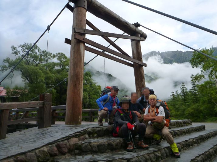 | 前日まで台風の影響で強い雨を降らす低気圧が日本を北上していて、山への計画実行を躊躇させていたが 前日の夜7時に予報を確認すると前線は北へ去り明日から晴れそうな気配だ 去年から認めた計画でもあり、最悪涸沢まででもいいかぁ~と言う事で決行を決断する。 朝4時集合、天気は今一で雲は厚いがこれから晴れる事を期待しつつ沢渡へ下道を走る 沢渡駐車場はガラガラだ。タクシー乗り場横に新設された川上商店目の前の駐車場に案内され駐車 日割り500円で三日分支払、五人用のタクシーでお得に上高地へ バスターミナルはひっそりしていて人影もまばらだ、準備を整え河童橋へ、一応恒例の全員写真 穂高連峰は残念ながら雲に覆われていたが明神方面には青空が広がり今後の好天を期待させられる 梓川沿いに進み、明神では川向こうの穂高神社をお参りして安全祈願、徳沢では一休み そうして新村橋から奥又白池を仰ぎ見て横尾へ到着、ここで大休止だ |
