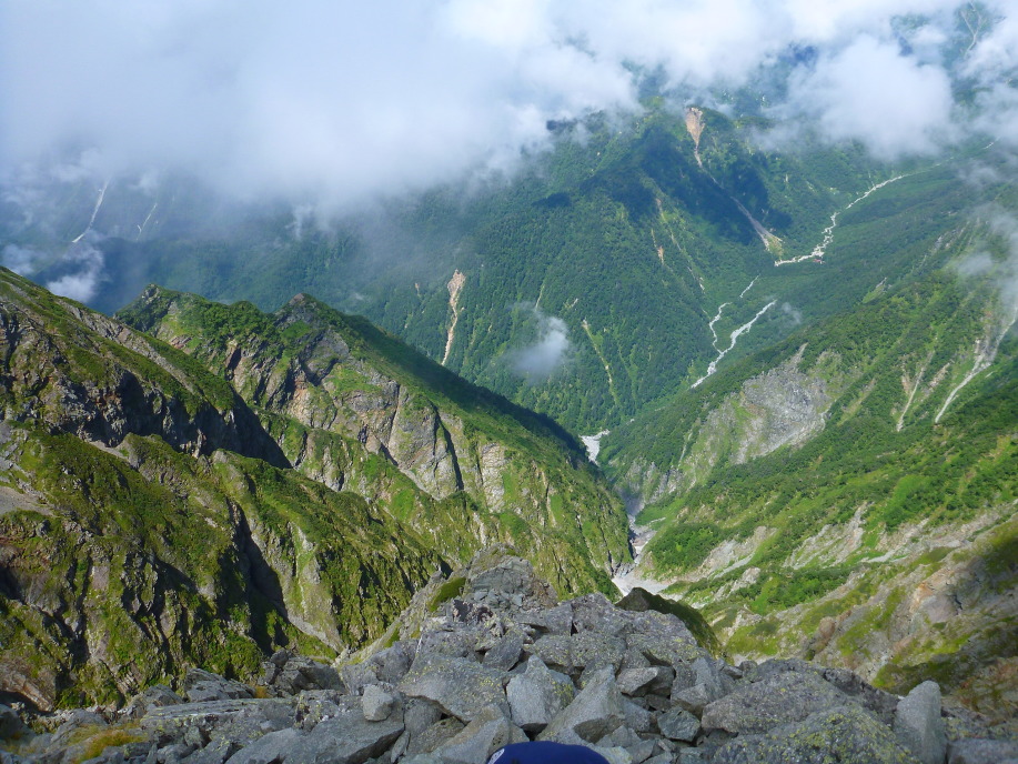 | 厳しい岩場をクリアーしつつ下れば少しづつ雲が割れて視界が時々広がるがあっという間にまた塞がる そんなこんなの天気の中急登のコースをヒタスラ下る やがて岳沢小屋が眼下に拝めるようになればパノラマ展望台だ 晴れてれば素晴らしい光景だろうな?想像の世界を頭で描く ここからの下山道は急なガレ場が多く登って来る人達と擦れ違うが皆キツソウに顔をゆがめているじゃないか 頑張れ!と声を掛けあい擦れ違う |