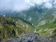 | ③ | 北穂南峰からのピークに て、ここの足元から 滝谷第四尾根方向の 岩場を下る 高度感あるが足元は しっかりしている |