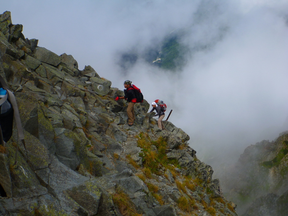 | だそれでもずっ~とガスの中、雨では無いがガスで濡れながらカッパを着込んで吊尾根を行く いきなり鎖場かよ!出足は意外に厳しいが、そこを越えれば縦走路だ ガスのお陰で高度感は全く無い。 吊尾根縦走の3パーティ位の人達と抜きつぬかれつを繰り返しやがて最低コルの分岐へ ここで少し休むが紀美子平は直ぐだった。 |