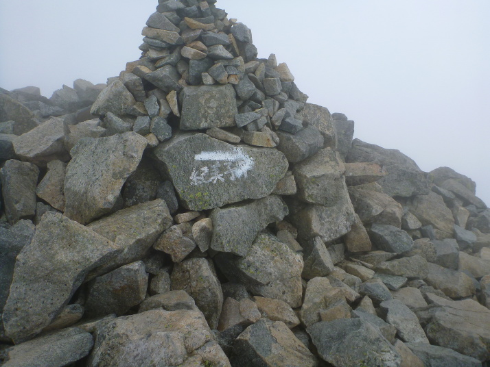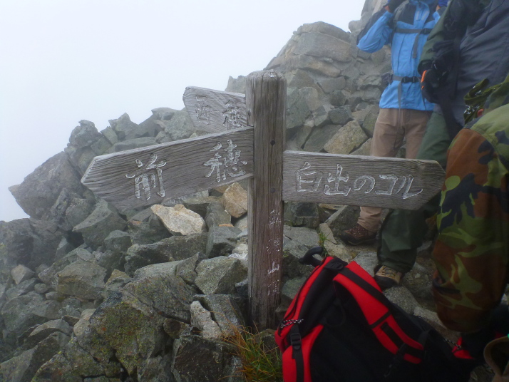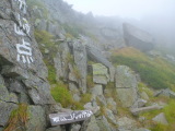 | その後は晴れていればロケーションの良い 岩場の登山道を奥穂に登頂するのだが、相変わらずの ガス模様…ロケーションは無く迷い尾根を直角に 間違わない様に進めばガスの中の奥穂高に到着 取り敢えず全員で写真を撮ってもらい早々前穂に向かう ここからは初体験、慎重に行こう! |