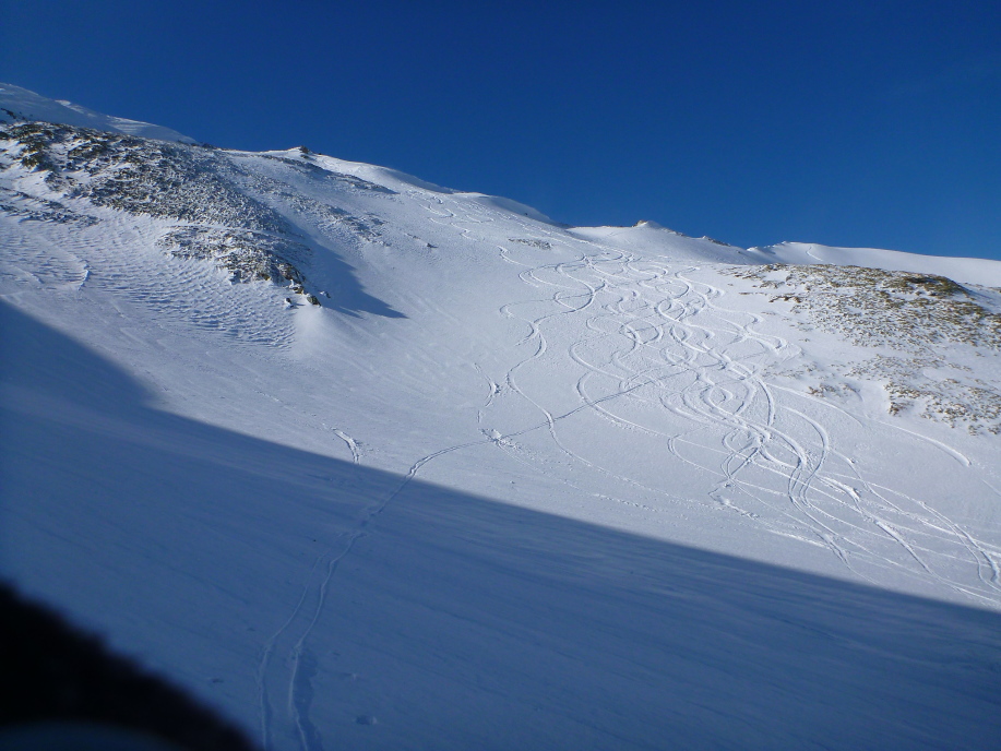 | ではそろそろ楽しみますかね? 時間的に剱沢小屋までは無理なので途中の平らな場所を目指します では…いざ! 滑降はあっという間で小屋までハイクアップ… シールが凍てついて板に張り付かづ苦労しながらやっとの思いで 剱御前小屋へ ここで少し休憩した後は雷鳥沢に向けて一気に楽しみます |