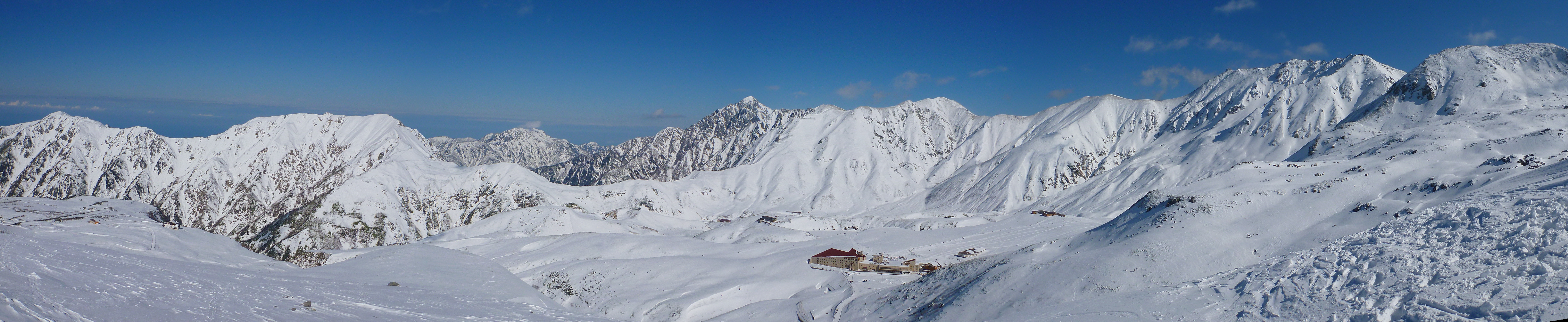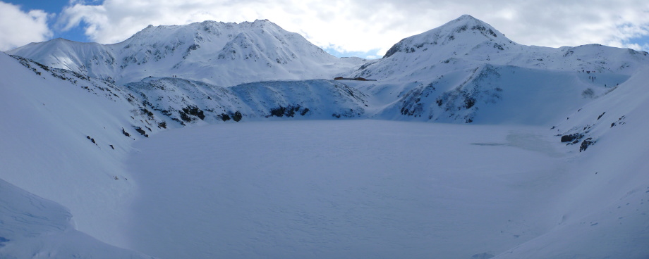 | 関東の出張を終えて自宅到着は17:00、同僚の運転だったのが助かった。 早々に準備をしておいたザック等を車に積み込み、忘れ物無い様確認して 内のやつに見送られながら一路下道で富山県を目指す。 R41をヒタスラ走り、下呂~高山、飛騨古川を過ぎ富山へ… 途中コンビニで食料を仕入れて何度か通って見覚えのある風景を走り立山駅駐車場へ 17:50出発の22:43到着、丁度5時間の道程だね 春と違ってこの時期の立山からのアプローチは天気次第で通行止めになる為 意外に駐車場は空いている。楽々駐車して取り敢えず軽く宴を開き、明日に備えて 24:00には睡眠だ。疲れているせいもありぐっすり熟睡でした。 朝、目覚めたのはゆったり6:30、周りを見渡せば多少駐車台数は増えたもののそれ程でも無く 慌てて切符を買いに走る事も無さそうだ…それに始発は8:20だしね? ゆっくり準備をしても楽々だ。 空を見上げれば雲一つない快晴! それだけで気分は安らぎゆったりと準備をして7:30過ぎに切符売場へ 丁度シャッターが開き発券を始めたところで楽々だ。 事前にHPで仕入れた割引券で購入し、待合のベンチで朝食を摂りながら出発を待ち 8:20の始発のケーブルカーで美女平らへ…ここから高原バスを20分ほど待ち 室堂へ9:40に到着する。 素晴らしい快晴の青空の広がる室堂は別世界だ 浄土山や室堂山へハイクアップする人達を目で追い 早々にシールオンして今宵のお宿を目指す…トニカク人が少ないなぁ 雪景色を楽しみながら…立山の山並みを満喫しながらエッチらとハイクアップで みくりが池を過ぎリンドウ池を外から回り込み雷鳥ヒュッテへ到着だ、10:25 |
