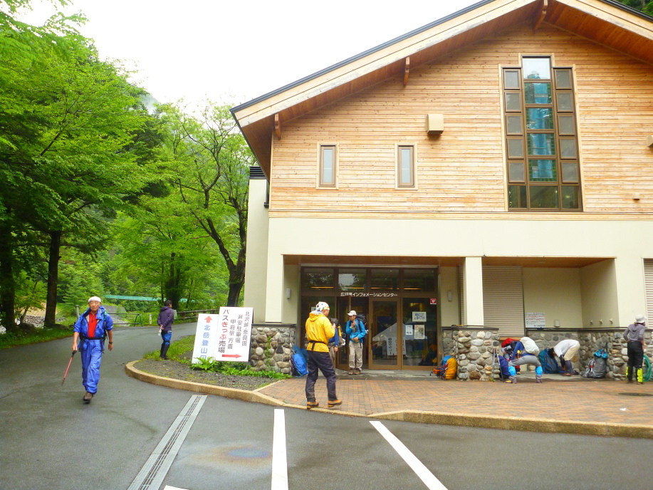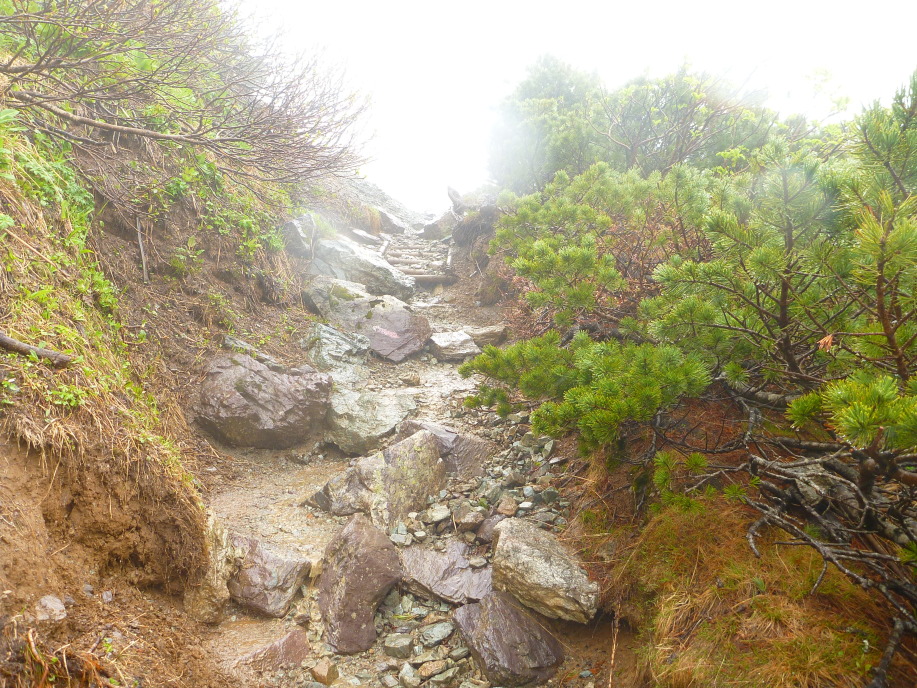 | 御嶽山依頼の3000mを目指すKriさん、槍ケ岳依頼久しぶりの3000mのSさん、女性二人は小屋泊まりなのに 意外に荷が大きく出足の急登から息が荒い?そう言う自分も荒いのだが? そんなこんなで天気が良ければ大樺沢の雪渓歩きを予定していたのだが、この天候ではホワイトアウトで 落石の危険もあるので白根尾池小屋を目指す林間コースに変更だ。 雨に濡れるゴゼンタチバナ、ツバメオモト、ハリブキ等の花を見ながら 途中沢を渡りながら、第一ベンチ、第二ベンチの休憩ポイントを越えて、結構な急登を登る事1:40、 白根尾池小屋に到着する。雨脚が強くなっている。 |