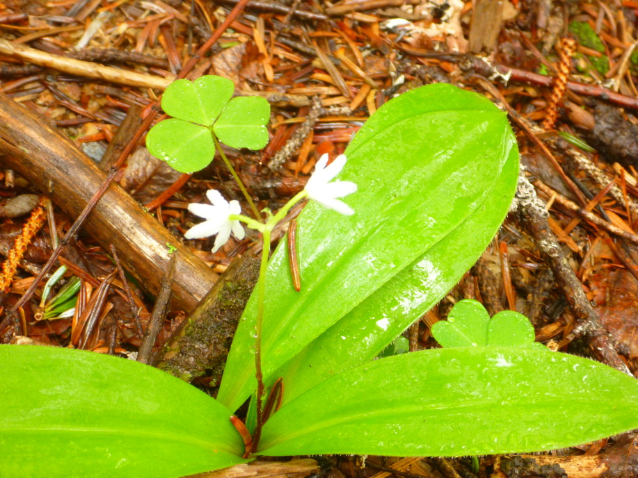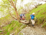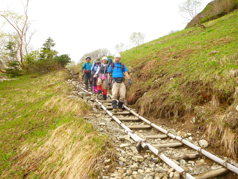 | この草すべりがなかなかの急登で、尚且つ霧雨にやられながらでなかなかキツイ訳で… 途中Sさんの調子が悪くなり一気にスピードダウン、何度か休憩しながら進むものの 息が苦しそうで登山そのものをどうするか?位い苦しそうになる。 結局何度か休憩し、最終はSさんの荷の中身を少し男子が持つ事で荷が軽くなり 何とか歩けるようになりゆっくり肩の小屋を目指す。 小降りとはいえ雨の中の登山はなかなか厳しい、 登山道には相変わらずニリンソウが多くみられるが、途中黄色のシナノキンバイも見られるようになり 右又コース合流地点にはショウジョウバカマが多く咲いていた。 此処で大きく休憩し、更なる急登を小太郎尾根に向けて登り詰める、 依然と雨は降り続いていて景色は無い…こんな筈じゃ無かったのになぁ |