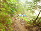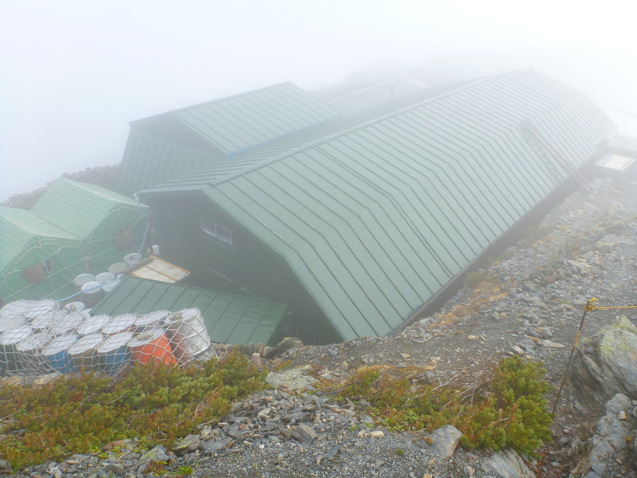 | 今回の北岳、目的の第一はキタダケソウ、それも達成できぬまま下山するのは忍びないが 自分の体調もさることながら…メンバーの気合もこの天候で今一だ。 ゴメンナサイ!! 着た登山道を戻り、途中担ぎ上げられなかった自分の荷も回収して小屋まで降りて来れば 多くの人達がこれからどうしようと?算段中だ。 時々青空も覗くが基本雲の中、天気は良くない |