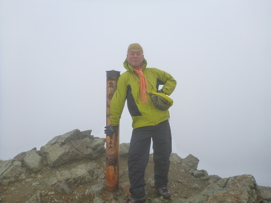| 少しばかりの晴れ間が時々覗くが見上げる頂上は依然雲の中だ 小屋を回り込むように頂上を目指す、時々強い風に煽られながらガスの中黙々と? しかし体が動かん!途中ザックをデポして空身になり頂上を目指す、 二日酔いの後遺症はかなり身体にこたえる様だ、そうこう何とか?登り詰めれば 頂上到着、それも、なぁ~ンにも見えん頂上だ。それでも北岳初制覇の3人山はご満悦かな? 写真を撮りキタダケソウは諦めて早々に下山する事にする |