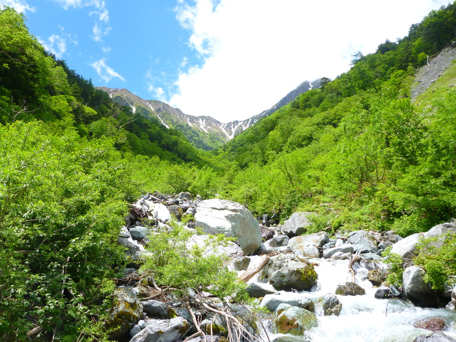 | まだ胃の落ち着かない自分の身体を抱えて肩の小屋を後にする、下山は一気でガスの中、あっという間に 大樺沢方面への分岐だ、ここからはダケカンバの樹林の中、斜め斜面の山肌をグングン下る。 途中大きな雪渓が登山道に立ち塞がるが踏み跡を辿ってグングン先を急ぐ 幾つかの雪渓を越した所で大樺沢の大雪渓に出る 此処を少し下れば二股の休憩ポイントだ 二俣でやっと小屋で出して貰ったお弁当を食べる、やっと二日酔いも抜けたかな? 朝北岳に向けて出発したのが6:30、今此処で昼食を食べられたのが9:20、3時間余りの後遺症だね! そんなこんなで二股で大休止です。 休憩の後は雪の多い樺沢の雪渓を下り、直ぐに岩場の登山道の下山となりヒタスラ下山が続きます。 左岸から沢を一旦右岸に渡り延々汗をかきながら下山し、またまた右岸に渡れば 広河原からの登山道に合流、後は来た道を下ります。 この頃になれば天気も回復しており陽射しも強く体に汗が纏わり付く いつもこんなもんだね 帰って来た野呂川を渡る橋から振り返ればこれだもの! 素晴らしい北岳が遠く空に突き出しているのが素晴らしい |