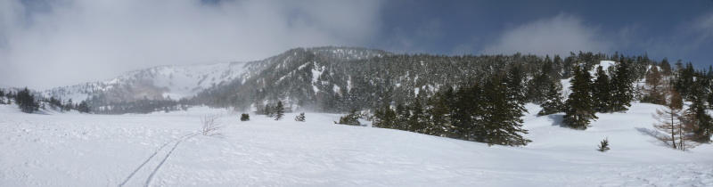 三日目の朝は微妙な天気 今日の予定は単独バックカントリーだ お昼には横手でH氏との待ち合わせもある 希望的な解釈で西から晴れてくるだろう…?? そんな訳で朝一番のバスで横手に向かう。 8:20発だ。 横手第一リフトから陽坂リフトを乗り継いで最後のスカイリフトを降り立てば パラボラアンテナがガスで霞む ピーカンなら素晴らしい景色なのに 奥にある渋峠スキー場を滑降し長野と群馬にまたがる渋峠ホテル横からR292を草津方面へハイクアップ開始だ 9:32、気温マイナス12℃、風邪はそれ程でも無いが視界が悪い。 ゆるゆるダラダラなノートラックな国道を新雪踏みふみ20分ほど歩けば 国道最高地地点(2172m)に辿り着き証拠写真 シールを外して滑降だ 視界の開けた国道から下を見やれば芳ヶ平の素晴らしいバーンが広がっている、 が、雪崩が怖いので少し先の尾根を滑る事とし国道を滑る 滑降地点は直ぐでシラビソの林間を芳ヶ平に向けて…いざ!! 雪は完璧モナカ状態で板が引っ掛かり苦労しつつも、あっという間に芳ヶ平です 途中亀裂の入った急斜面を避けて北に大きく回り込んだ為に少々時間をロスしたが 10分ほどのスキーを楽しみました 芳ヶ平の湿地帯を越えて夏道に辿り着き、ここからハイクアップだ 国道滑降地点では曇っていた空も標高を下げるに連れて青空だ それも快晴…でも横手方面を見上げれば雲の中、山の天気は少しの距離と少しの標高で こんなにも違うんですな ハイクアップ途中から芳ヶ平を振り返る 中央に本白根山と白根山 芳ヶ平ヒュッテの頭が見えます 白根山 晴れれば最高の雪山ハイクアップだ、汗がしたたり落ち、半袖でも気持ち良い それにしても雪面には何の足跡も無いのが不思議だ、兎も居ないのですかね? そんなハイクアップを2時間ほど頑張れば渋峠に到着する。 此処まで戻ると元のガスった天気に逆戻りだ 渋峠のリフトに乗りH氏との待ち合わせ場所の横手山山頂ヒュッテへ だらだらゆったりと時間を潰し予定より遅れて到着のメンバーと合流 後はバスの時間まで横手山スキー場を楽しみます 最終のバスで帰り今宵は三人での宴で盛り上がり 眠りに就きました |