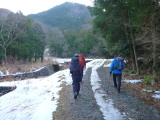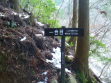 この時期この辺りは雪で覆われている筈だが登山道には全く無い、一度は降った雪が溶けたのだろう 九十九折に続く登山道を一合目、二合目と単調に詰めれば三合目の林道出合いに着く。9:03 この辺りまで来ると雪も多くなり気温が冷えているせいで硬い 安全を期して三合目直ぐのあざみ小屋でアイゼン装着、自分は軽アイゼンだ。