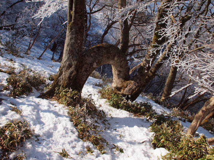 不動明王の祭られた祠がありベンチもある、ここからの急登の備えて少しエネルギーを補充し 樹氷も期待しつつ急登に取り付く、9:50 急登を登り始めて直ぐに樹氷がパラパラと現れ始め一眼レフを取り出して忙しくなる 山頂方面を見やれば白く纏った枝が太陽の陽を浴びてキラキラと輝いている 今回は期待できそうで高ぶる気持ちで急登を登る 既に頂上からの下山者も多くなり狭い登山道での擦れ違いに気を遣いながら目指す。 樹氷の中を登り詰めつつ写真に納め竜王山との分岐まで来れば頂上は直ぐ目の前だ 樹氷のトンネルを潜ると多くの登山者で賑わう頂上到着だ。10:25 頂上からの鈴鹿山脈のパノラマは何時も見ている三重県側からとは正反対で近くに見える鎌ヶ岳の 三様もなかなか荒々しい、雨乞岳も目の前だ。遠く澄み渡れば白山や南アルプスも見えるらしい? 此処の山の方位版は随分欲張りな遠くの山まで記してあった。 日曜日でもあり続々と後続の登山者が来られ広い頂上も所狭しと人で埋まって来た頃 お腹も満たしたし…と言う事で分岐から竜王山方面へほんの少し行った所にあるブナの珍変木を潜りに 下山を始める。 分岐を過ぎた所で見事な樹氷に再度撮影大会、いい写真を納めた所で珍変木に着く。 風雪のいたずらで出来た自然の木だが不思議な形だ 此処を潜ると幸せを呼ぶらしく皆で幸せ求めて潜ってみた。 果たして幸せは訪れるだろうか? 幸せを頂いた所で下山開始、11:18だ どんどん頂上を目指して登って来る登山者たちと擦れ違いながら 素晴らしい見事な樹氷に惜しみつつ別れを告げて何を急ぐ訳でも無いが早足でガンガン下山する 七合目、五合目、と来た所で雪もかなり緩んでおりアイゼンを外す、更に三合目、一合目と 脱兎の如く下山し林道へ12:26、下り始めて1:05で下って来ました。 駐車場は近くの空き地も多くの車が駐車しており大人気の様子です 下山後は武平峠へ少し走った所にあるかもしか荘でゆったり汗を流し 16:00には集合場所へ帰って来ました。 天候と気温に左右される樹氷 今回は泣けるような青空と言い、頂上直下の見事な樹氷林と言い 期待を裏切らなかった素晴らしい山行となりました。 皆、行いが良いせいなのかな? 樹氷のスライドショーへのリンクはこちら |