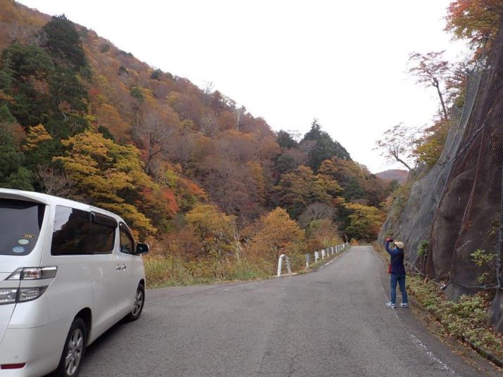 途中、白山展望台からは雲の纏わり付いた雪の白山が見えました、赤い楓に白い山が映えて奇麗だなぁ