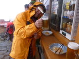 | 雨の中、涸沢テン場を後にしてグングン下山、あっという間に横尾だ | 明神を過ぎた辺りで逸れ友 | 恒例の河童焼き | |||