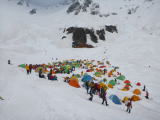 | 上りではそんなに思わなかった雪の下山道も意外に急で、ちょっと滑れば止まらないような… 慎重に一歩一歩。ザイデングラードの下りでは、ちょこっと足を踏み外し滑るが シリセード気分で思っているとなかなか止まらない。慌ててピッケルでの制御を試みるが これも以外に止まらない。正直ヒヤヒヤものだったが何とか制御できて大事に至らず… 安易なシリセード、安易な気持ちは禁物だ。 そんなこんなで皆其々に帰路を急ぐが、半分くらい下った所で 稲妻と雷が鳴り響き生きた心地がしない。 周りの下山者含め皆一斉に脱兎の如く下山だ。 正直、ピッケルは放り投げたい気分だ。 稲妻は北穂方面で大きく光り、耳には雷鳴が鳴り響く。 やっとの思いで、かなりまばらになったテン場へ、14:50着だ 後は無事を喜び合いつつ缶ビールを開けて宴の始まりである。 時々響く雷鳴を気にしつつ、残った食料と酒で無事を実感しながら知らずしらずに眠りについた。 |